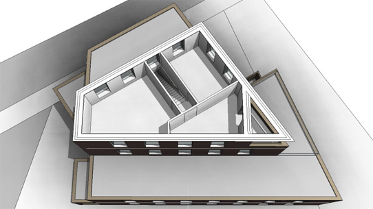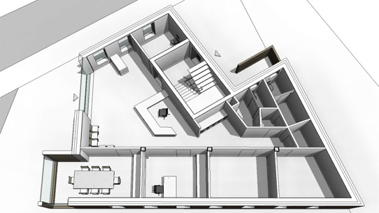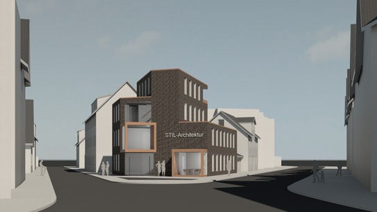 Der Entwurf zeigt die Bebauung an einem zentralen Punkt in Ricklingen: zwei Etagen Büros, Kellergeschoss mit Tiefgarage und ein Penthouse über zwei gestaffelte Etagen.