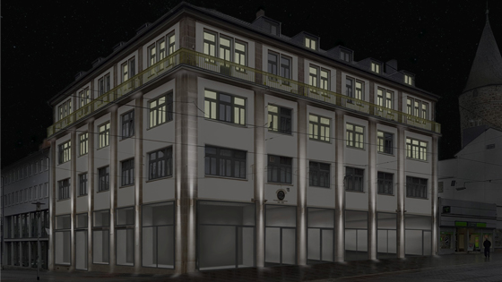 Der Bürokomplex in direkter Innenstadtlage von Kassel mit ca. 1300qm Verkaufsfläche, ca. 1000qm Bürofläche und ca. 500qm Wohnen soll entkernt, umgebaut und die historische Fassade erneuert und aufgewertet werden.